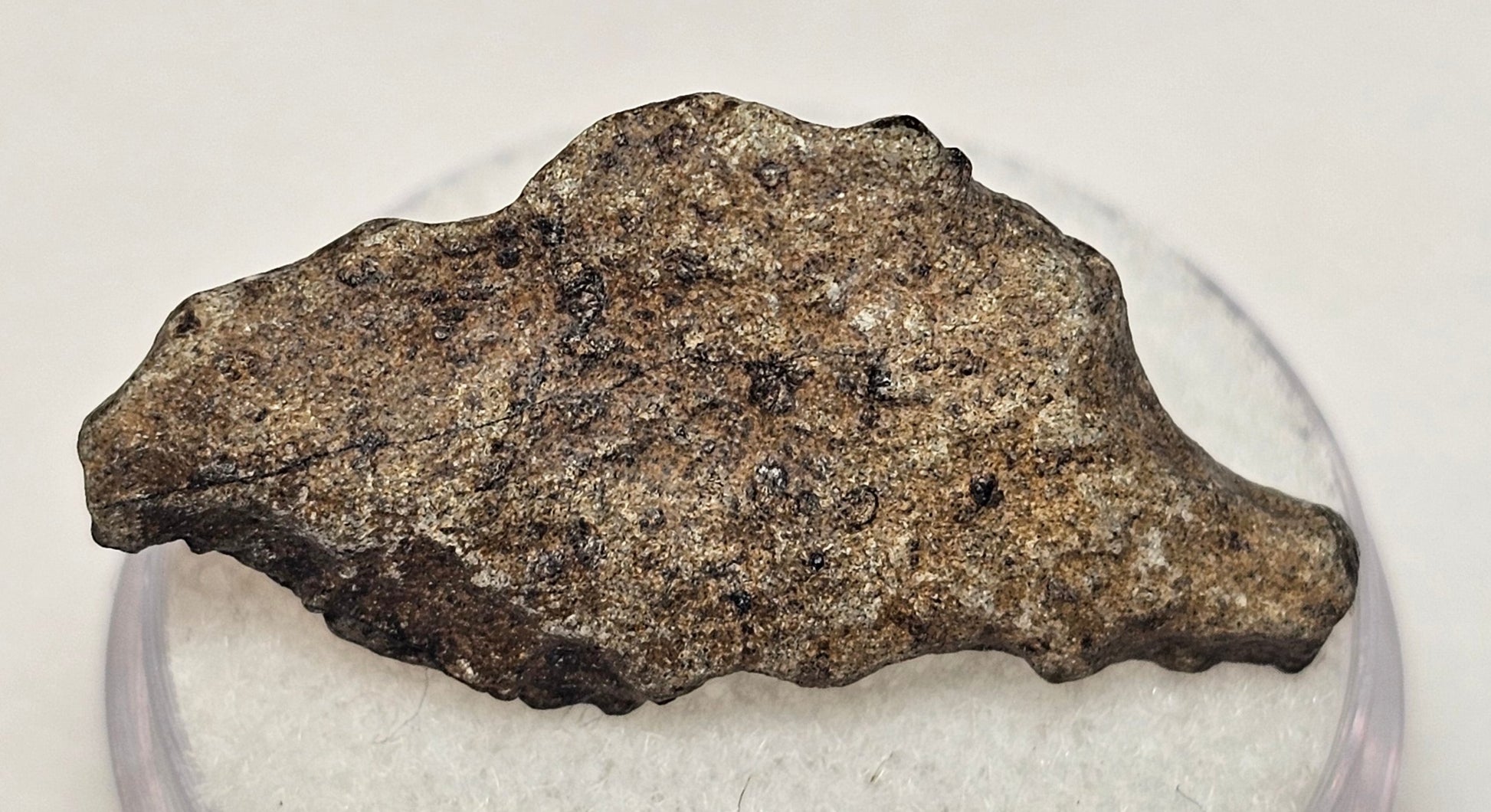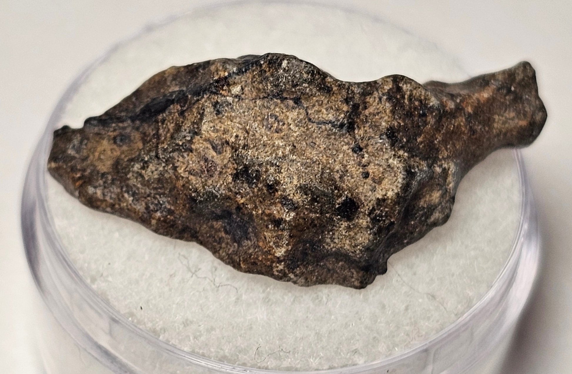 This is a very nice Martian shergottite individual called Amgala 001. Shergottites is the most abundant (50 out of 61) and the most diverse of the Martian meteorite subgroups. They are commonly divided into three types: basaltic, lherzolitic, and olivine–phyric (or olivine–orthopyroxene–phyric) shergottites. Lately, it's been very difficult to find. This meteorite was classified by Dr. Irving at the University of Washington. The total known weight for Amgala 001 is 34.67 kilos. This piece is 3.75 grams of it. All of my meteorites come with a COA as well as an information card.