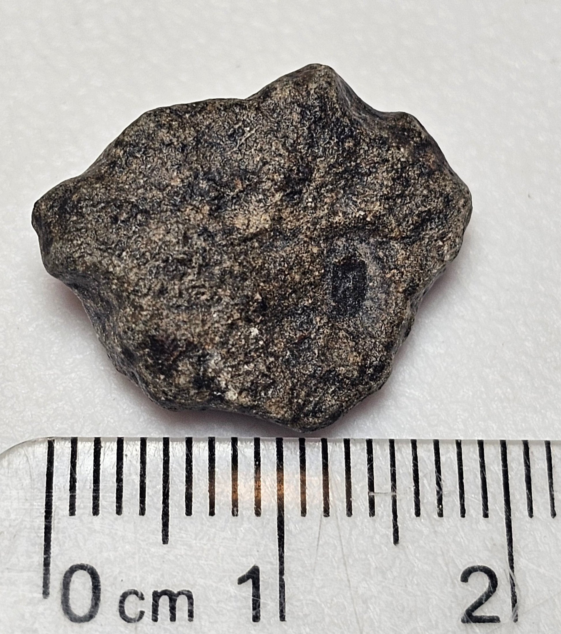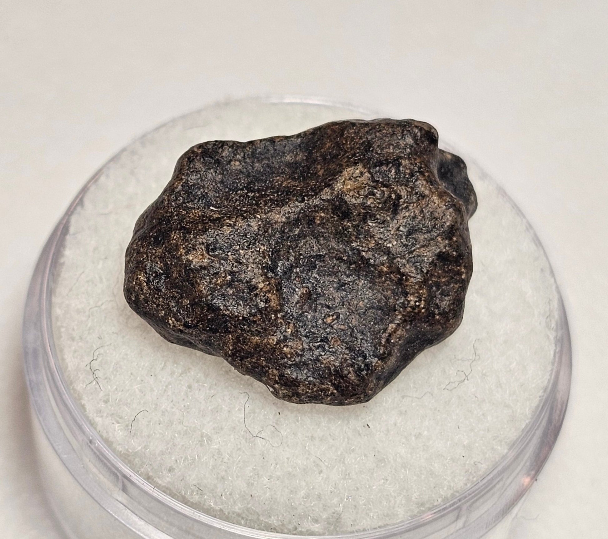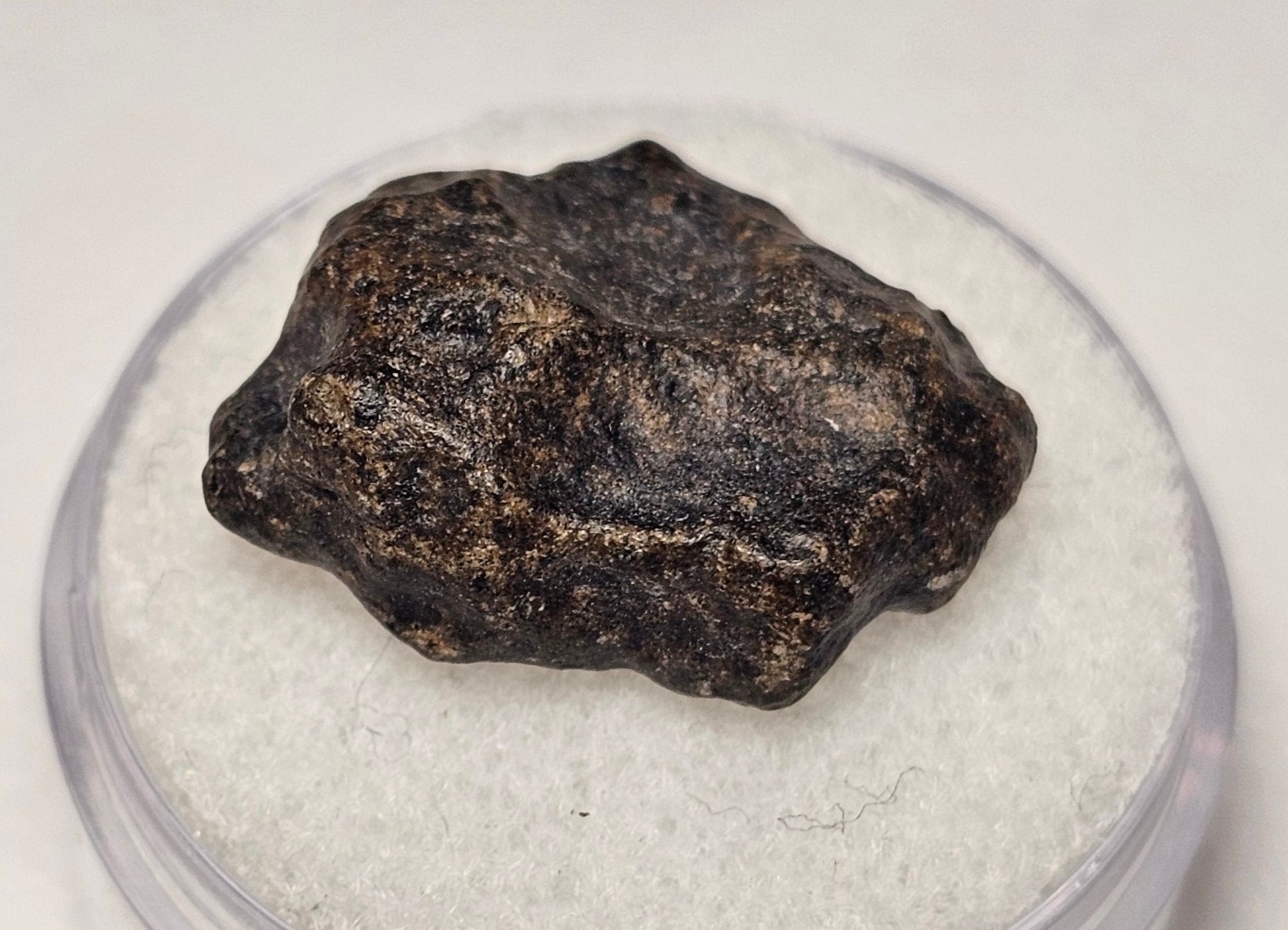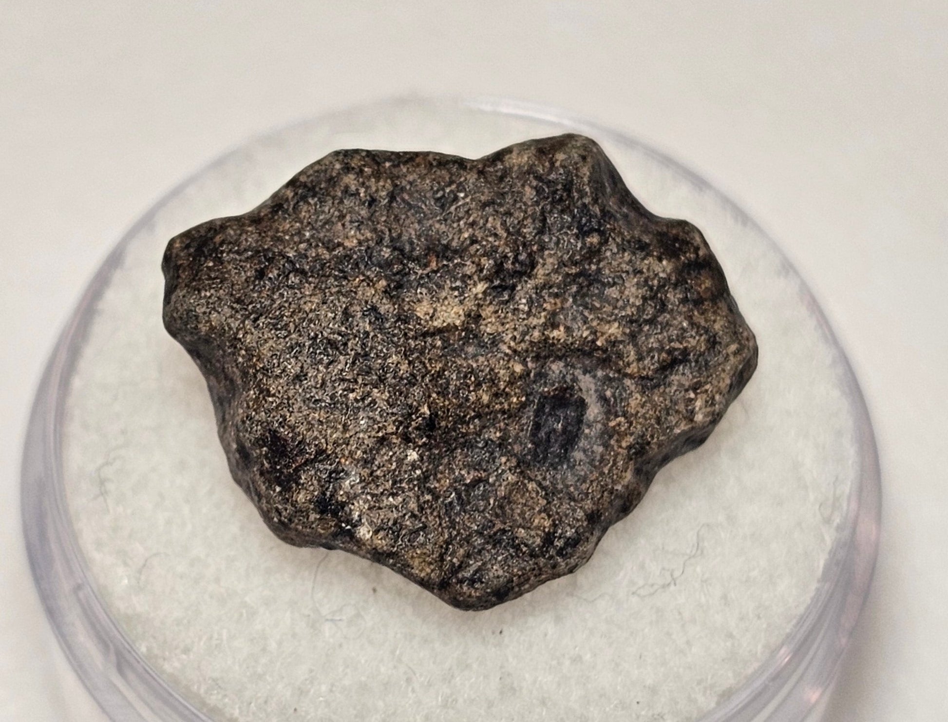 This is a very nice Martian shergottite individual called Amgala 001. Shergottites is the most abundant (50 out of 61) and the most diverse of the Martian meteorite subgroups. They are commonly divided into three types: basaltic, lherzolitic, and olivine–phyric (or olivine–orthopyroxene–phyric) shergottites. Lately, it's been very difficult to find. This meteorite was classified by Dr. Irving at the University of Washington. The total known weight for Amgala 001 is 34.67 kilos. This piece is 3.32 grams of it. All of my meteorites come with a COA as well as an information card.