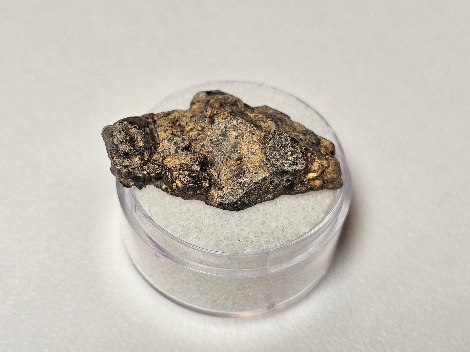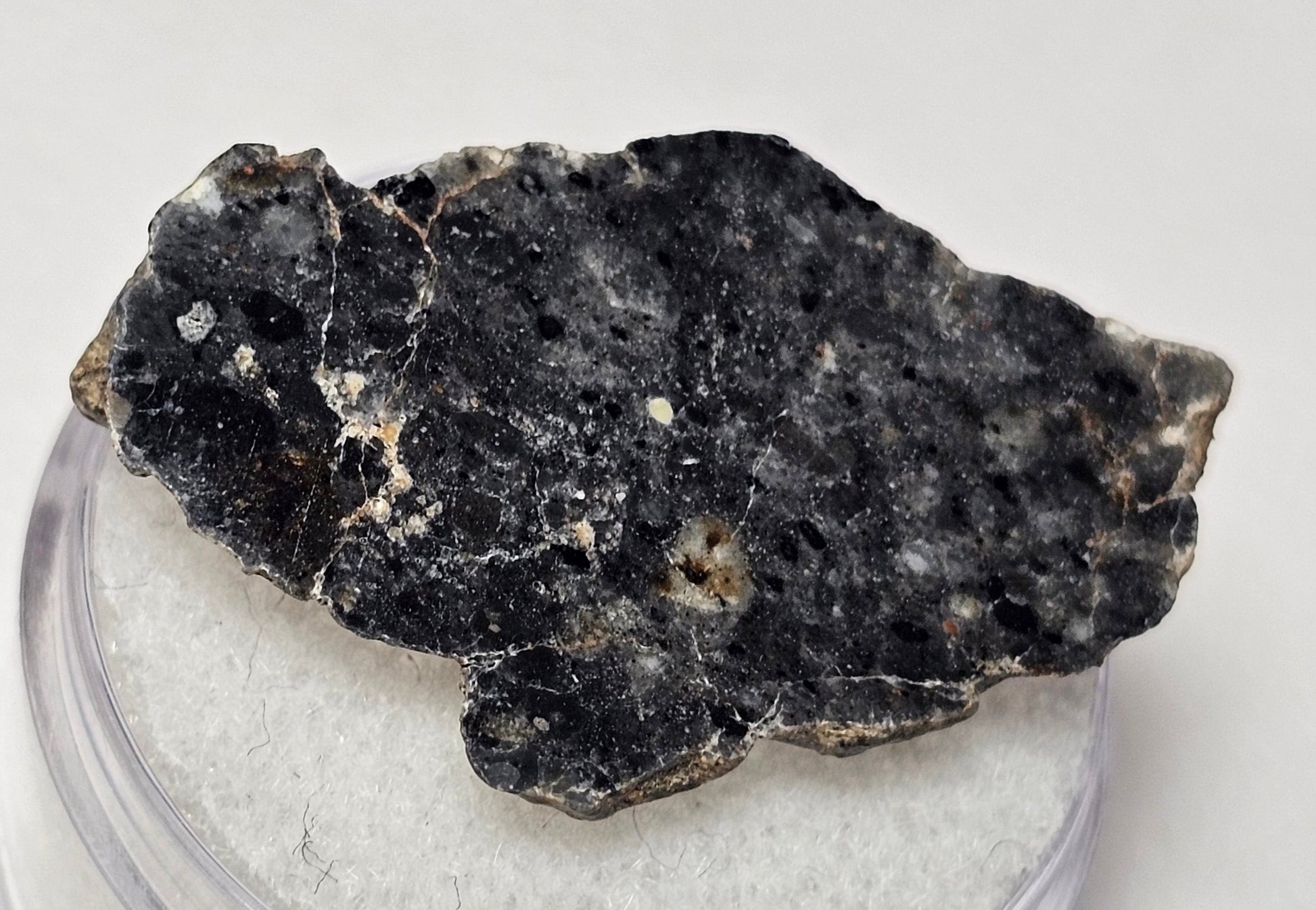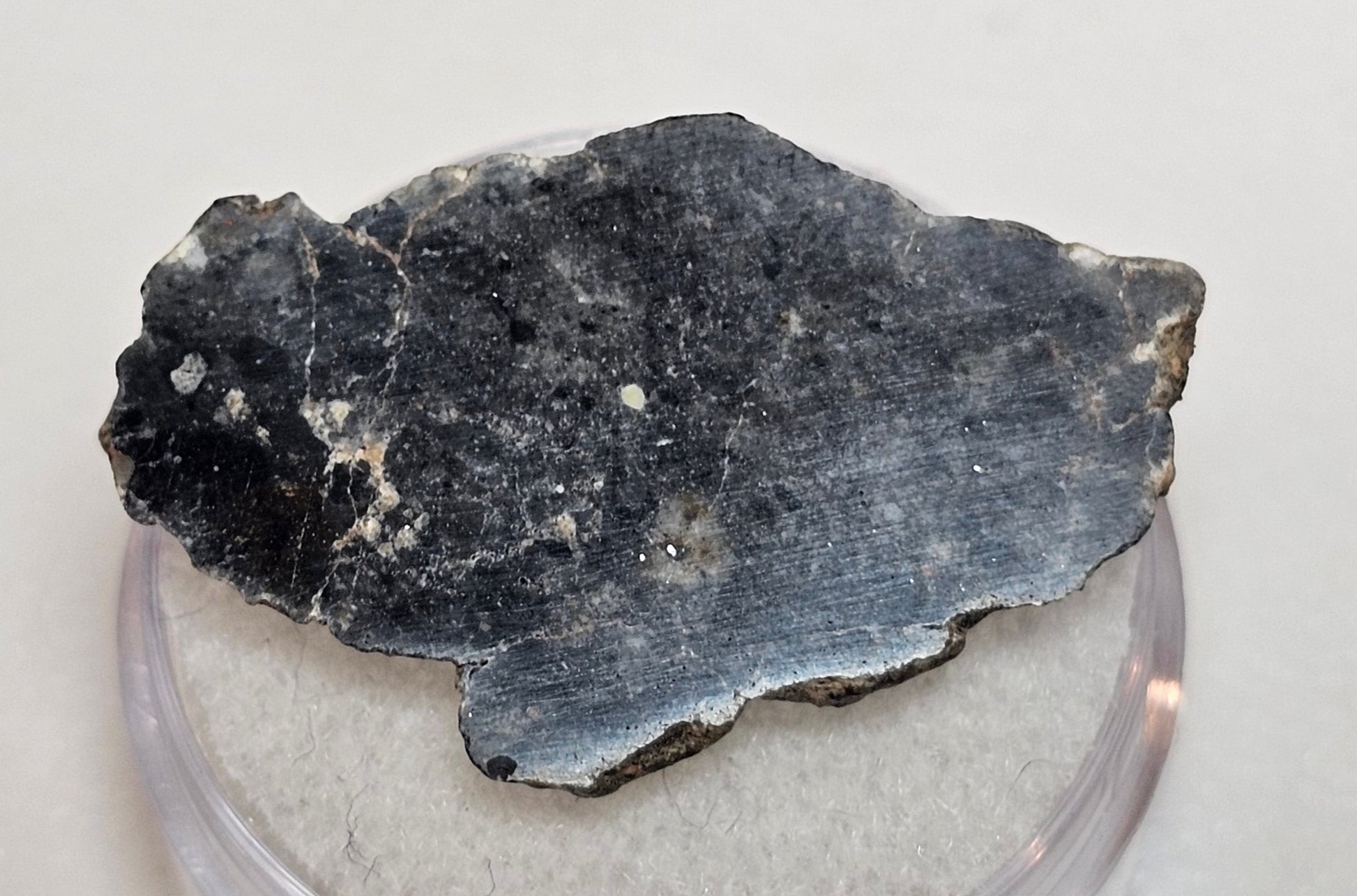 This is a lunar meteorite by the name of Bechar 003. It has been classified, cleaned, cut & polished. It was discovered in Algeria in 2022. It's a feldspathic breccia but some of these lunar meteorites were found to contain a lot of iron flakes. Usually, to see metal in lunar is rare. Only about 2 kilos of material were recovered. Like all of my meteorites, this piece comes with a certificate of authenticity as well as an information card about Bechar 003.