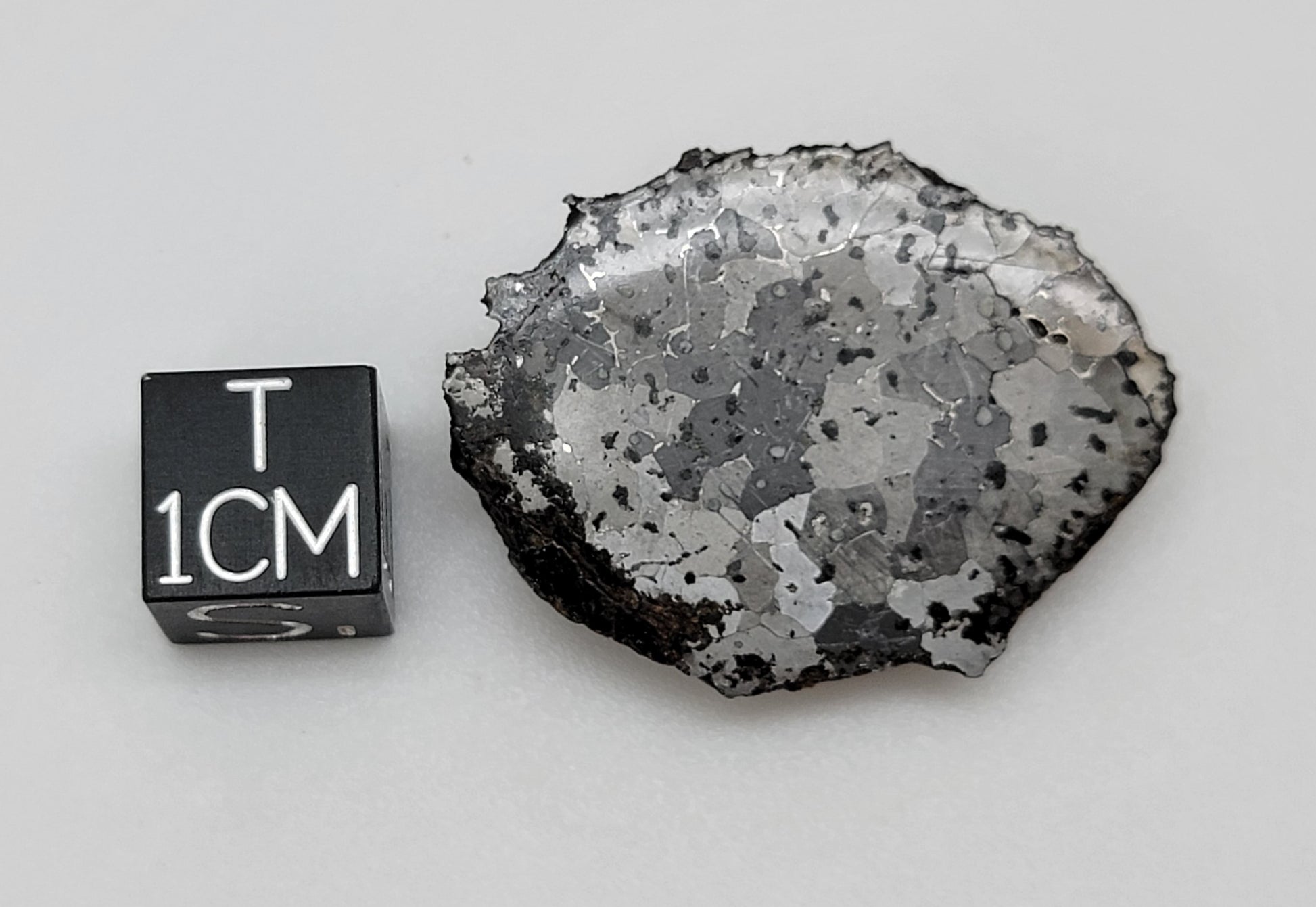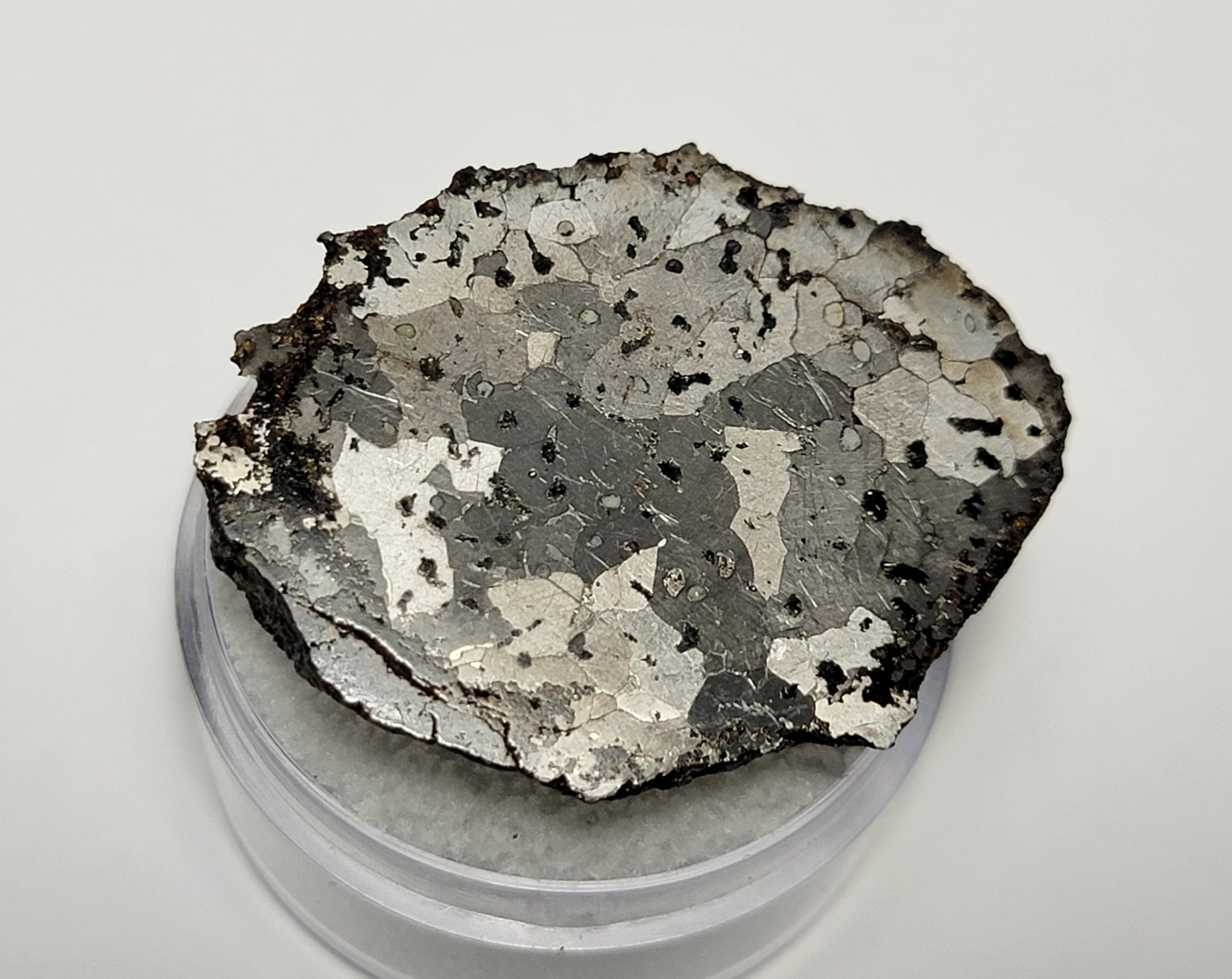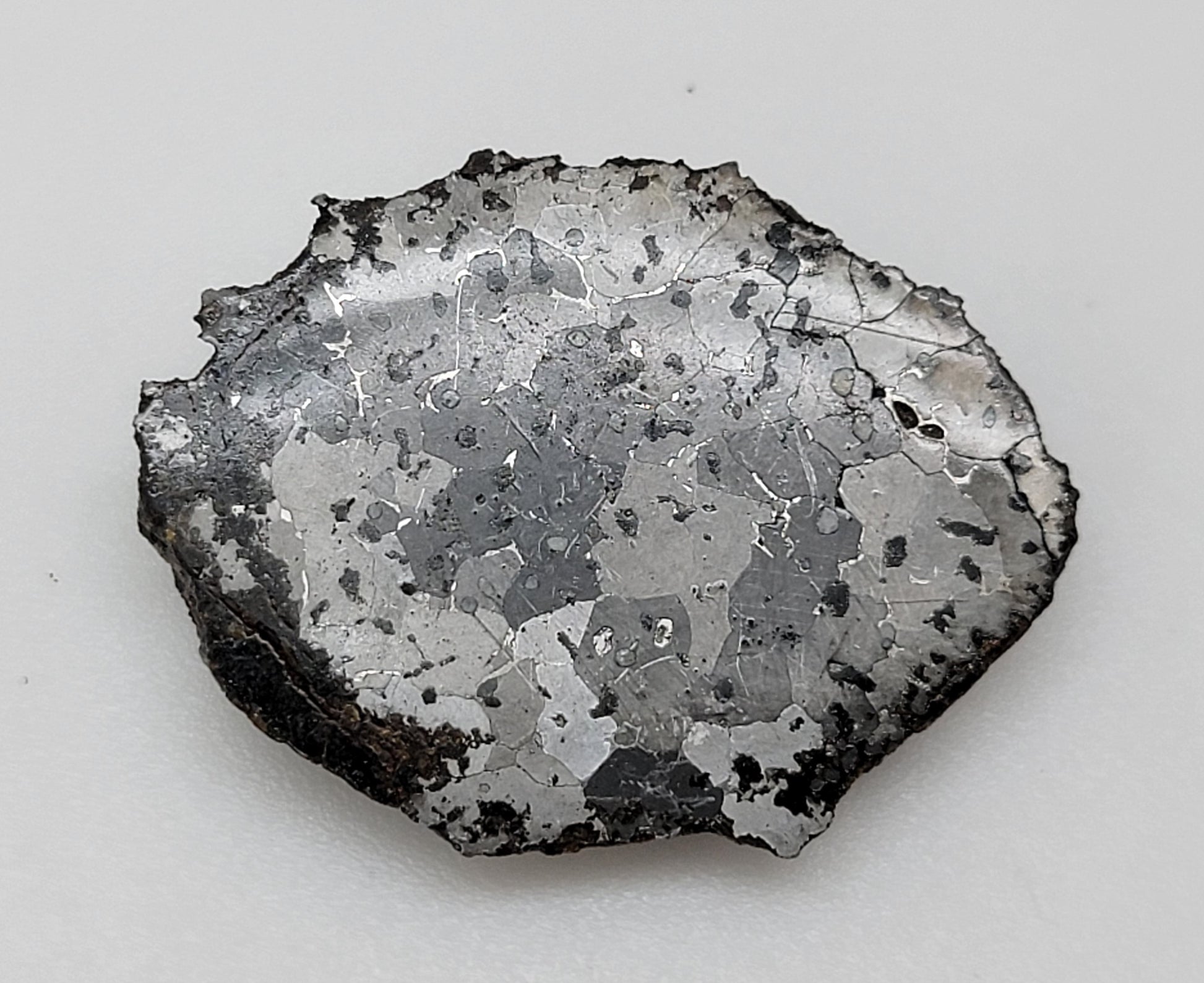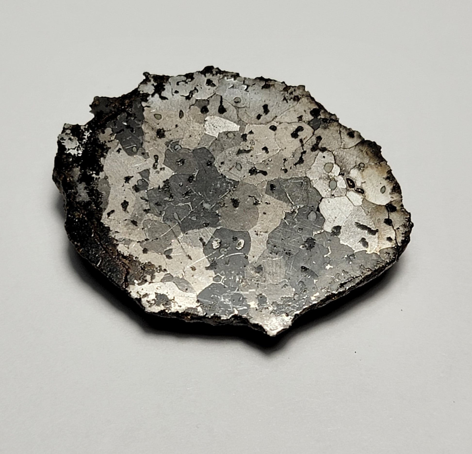 This is what we call a Bondoc nodule. It has been professionally sliced in half, polished and stabilized. Most of the meteorite has weathered away leaving behind these large metal nodules. The Bondoc meteorite is a mesosiderite with a fascinating story surrounding its recovery. It may have been known for a long time but its formal recognition as a meteorite occurred approximately in 1956. It was then that H. H. Nininger realized that it was meteoritic and not low-grade iron ore of some type as many individuals in the Philippines were reporting. It actually took 3 1/2 years for Nininger to acquire the 1955-pound stone from the jungle and get it to Sedona, Arizona. But what a special meteorite it is. It has large metal nodules besides the normal mixture of metal and mineral common to mesosiderites. Some small pieces are nearly metal free while others are nearly solid metal.