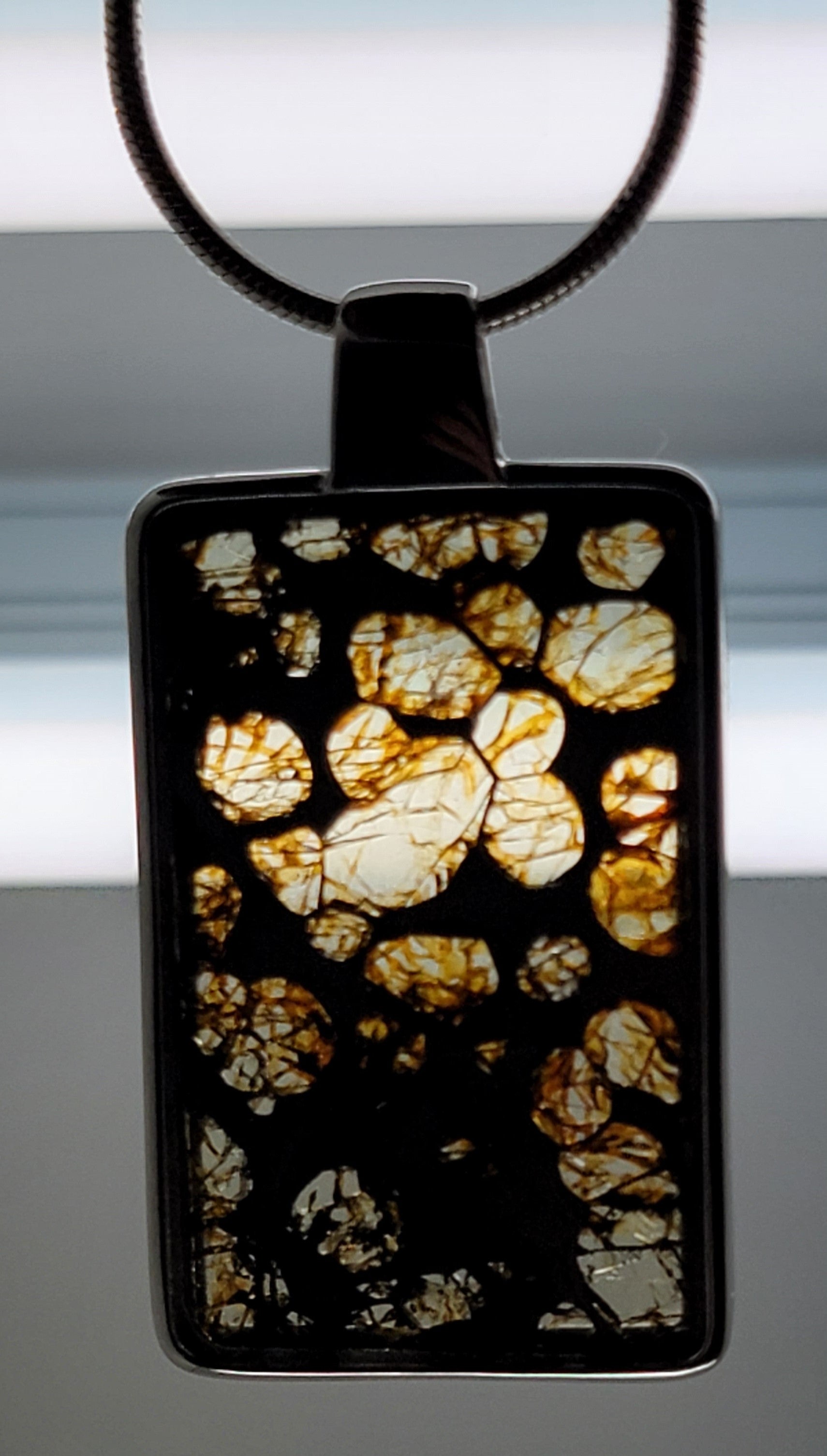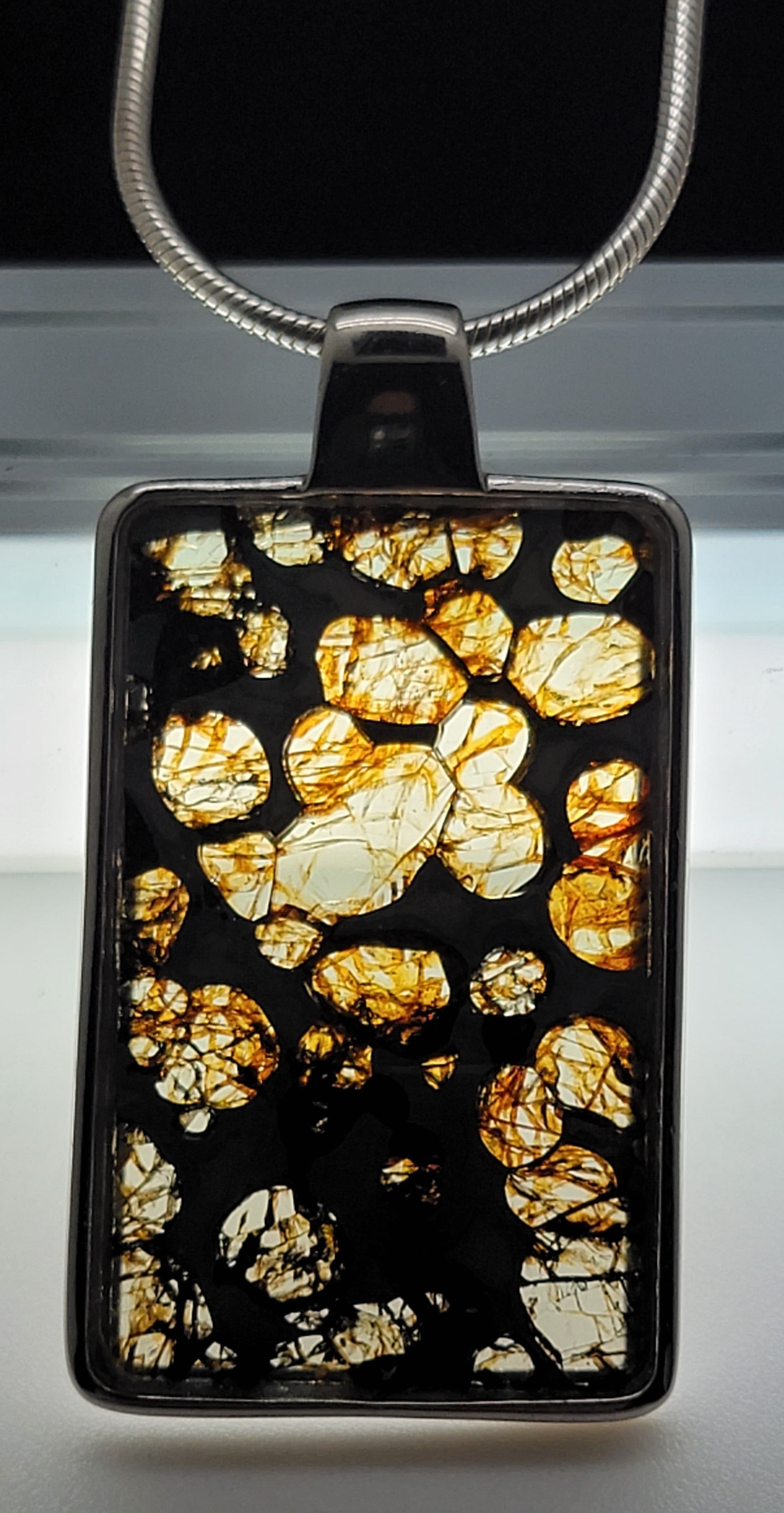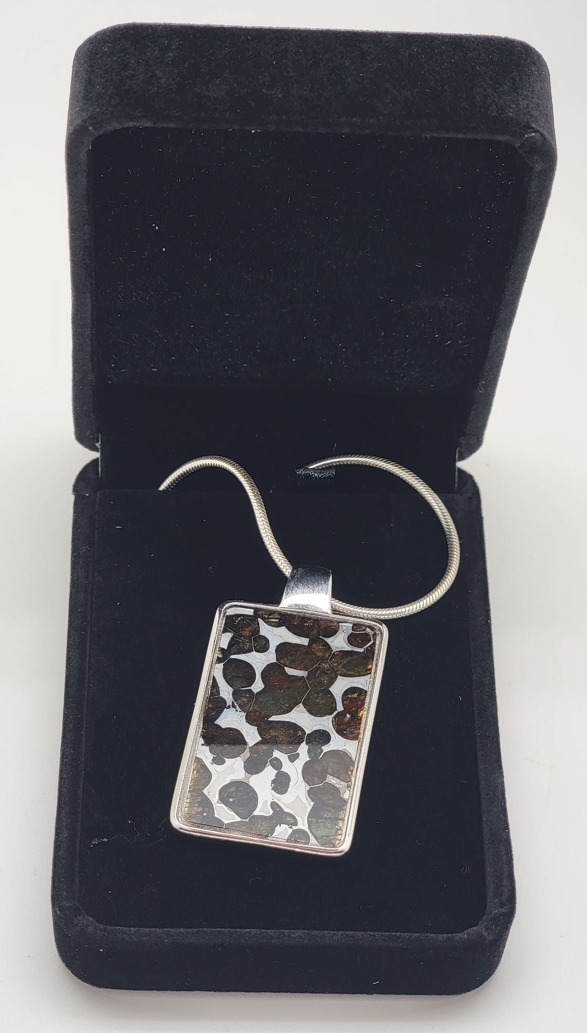 This is a handmade Sericho pallasite pendant that is highly translucent! This is a beautiful unisex pendant that has been stabilized and set in a sterling silver setting. The chain is silver as well. These make a truly out of this world gift for anyone! This necklace comes with a certificate of authenticity, information card and a black velvet gift box.