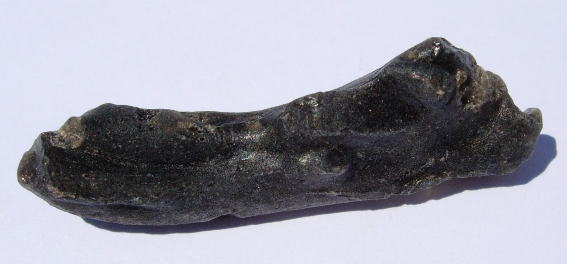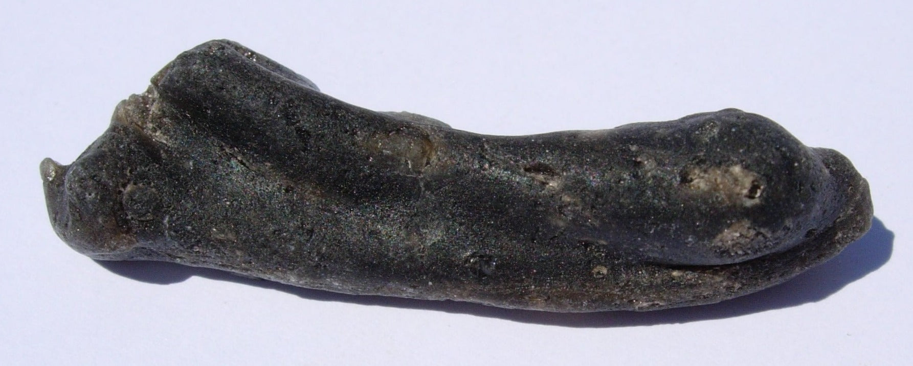 Darwin glass is an impactite. It’s a glass made up of a part of the earth’s crust that melted when an iron meteorite crashed into western Tasmania almost one million years ago. This impact generated a large amount of energy (enough to melt the crust, picture probably the equivalent of several atomic bombs), and created the Darwin Crater. Many craters around the world have glass which formed from the heat of the impact. But, the Mount Darwin Crater has glass which is quite different. Instead of being a black glass it is a grayish green. It is found with folds and twists as well as masses the look like large drops. Darwin glass is truly one of the most interesting of the impact melt glasses available to collectors.