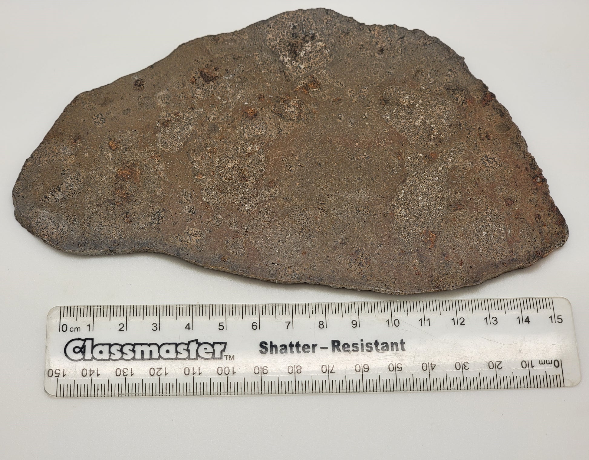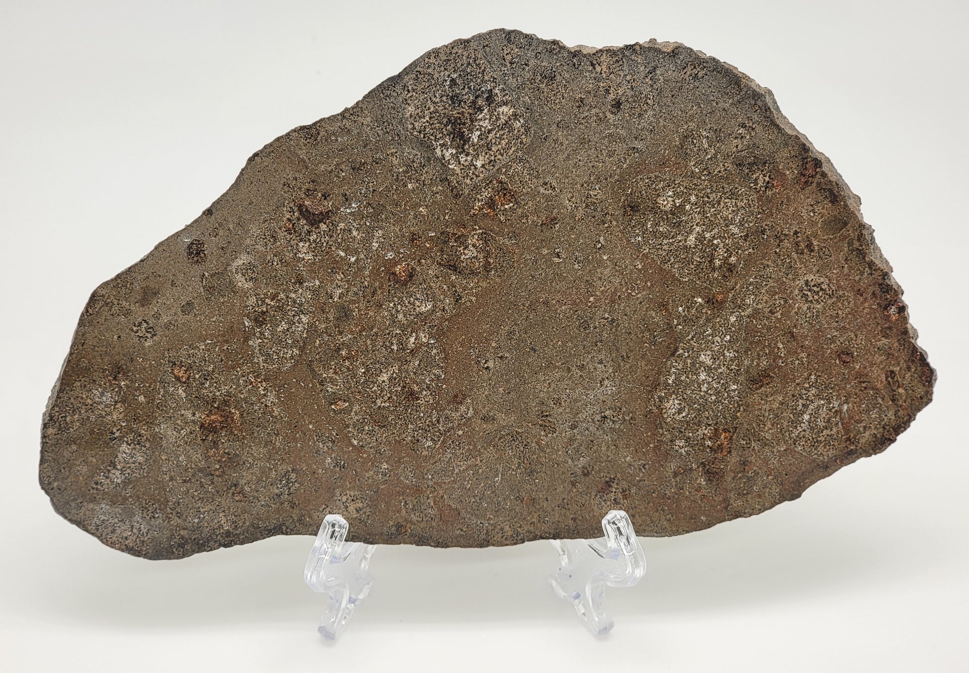 This is a beautiful, polished slice is called Jikharra 001. This is a new classification. This material was found in Libya in 2022. Numerous fragments reportedly totaling at least 2.5 metric tons, and possibly more that 3 T, were recovered in Northeastern Libya. Fifty kilos of it were subsequently purchased by the main mass holder from a meteorite dealer in Libya.