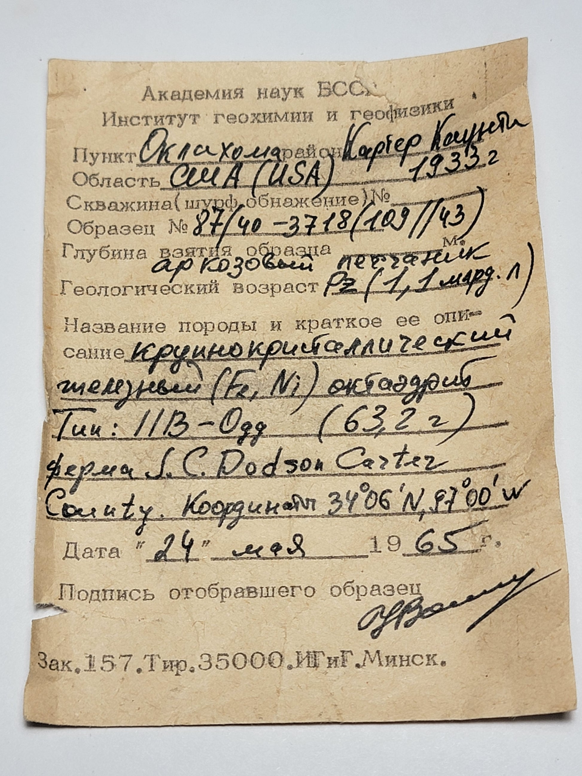 The Lake Murray Meteorite is the largest of its kind ever found in Oklahoma and now ranked as the fifth largest in the world. At that time, it was considered the largest known specimen in the world. The farm was sold to the state of Oklahoma about the same time of the creation of Lake Murray State Park, for which the specimen was named. One half of the specimen, also known as the main mass, was retained at Lake Murray, where it has been displayed at the Tucker Tower Museum since the early 1950s. This particular piece once belonged to the Russian Academy of Science and comes with the document in the photos.