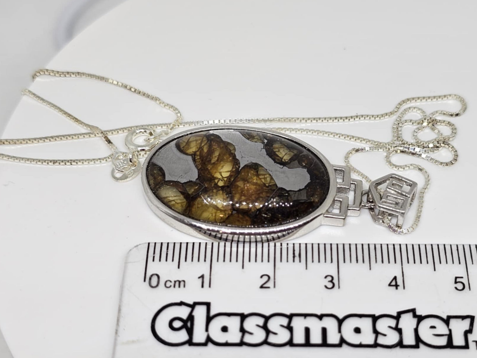 This is a handmade Sericho pallasite pendant that is highly translucent! This is a beautiful unisex pendant that has been stabilized and set in a sterling silver setting. The chain is silver as well. These make a truly out of this world gift for anyone! This necklace comes with a certificate of authenticity, information card and a black velvet gift box.