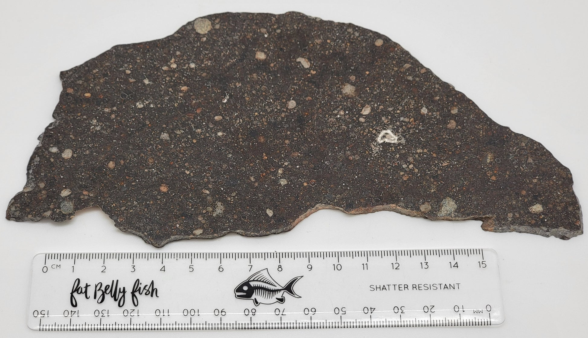 This beautiful slice is NWA 14659. This meteorite was found in the Sahara desert in Northwest Africa. It was purchased from a Moroccan dealer back in July, 2021. Only 12.9 kilos of this meteorite were recovered. It's classified as an "LL" because it has low amounts of iron and low overall metals, but within this amazing matrix you will find very large clasts. This piece was professionally cut and polished on one side. This slice comes in a Riker box to keep it safe during shipping. Like all of my meteorites, it comes with a COA.
