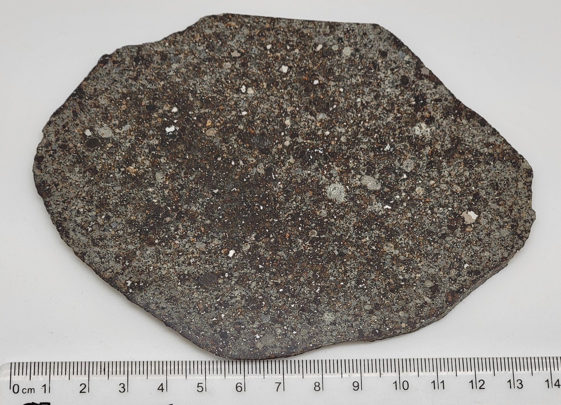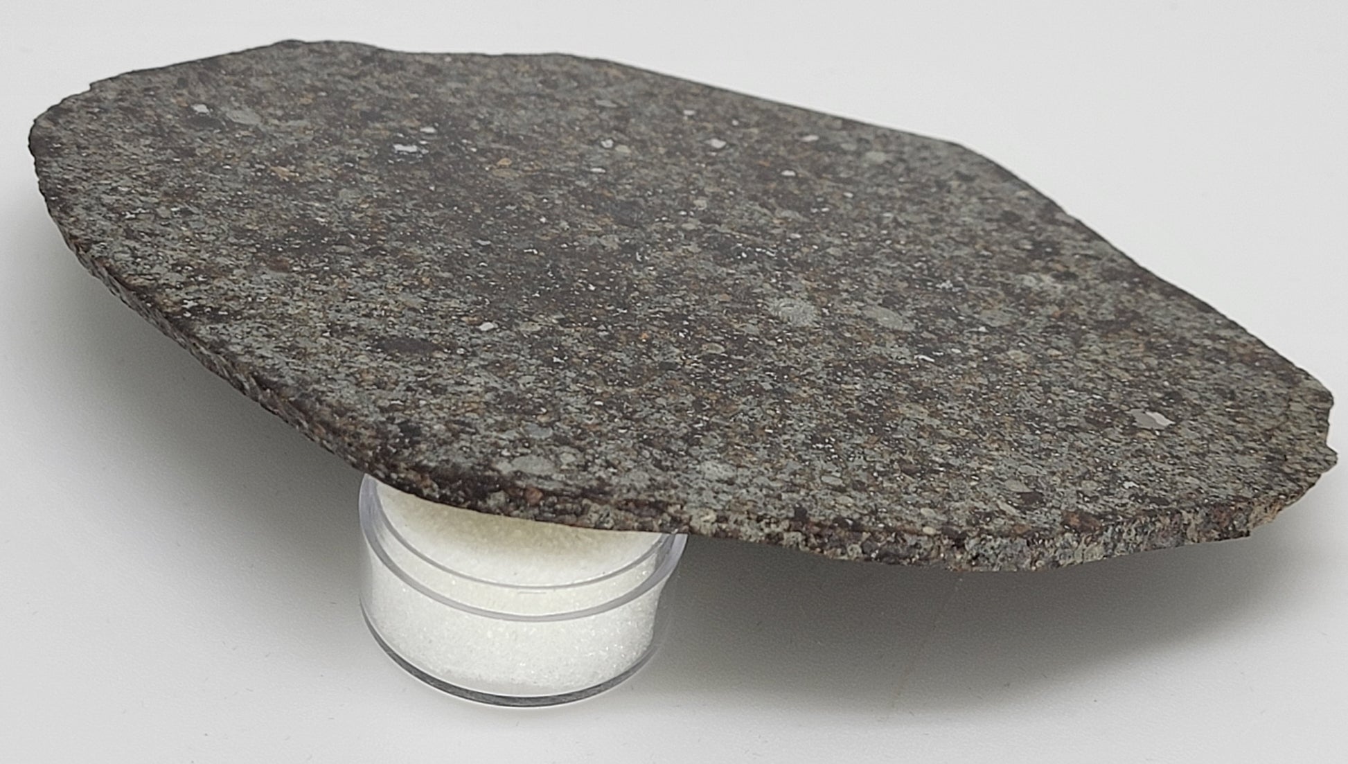 This is a beautiful slice of an unclassified Northwest African meteorite. It has been expertly cut and polished on one side. The back is not polished. This slice is loaded with chondrules! You will find big metal flakes as well as armored chondrules.